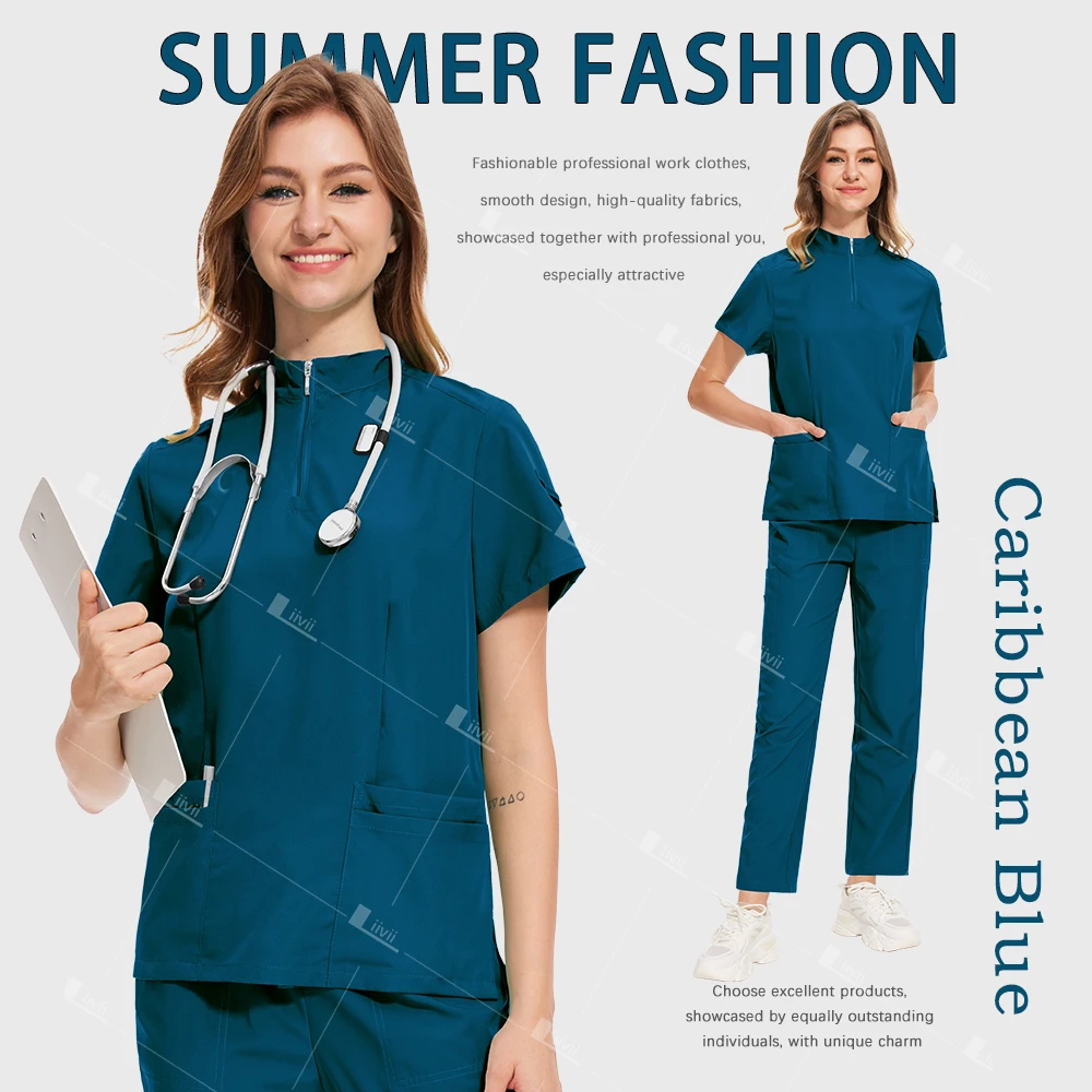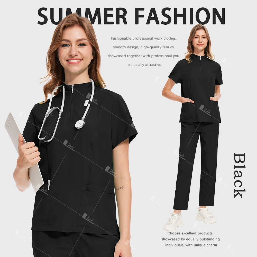 Fashion Black Uniforms Woman Beauty Workwear Medical Scrub Set Doctor Nurse Nursing Clothes Clinical Scrubs Top Pants Sets S-XXL
