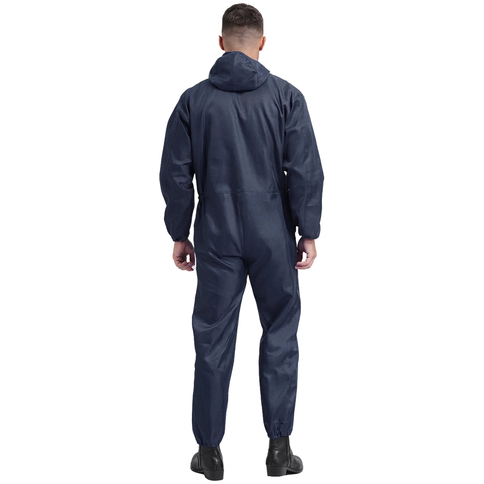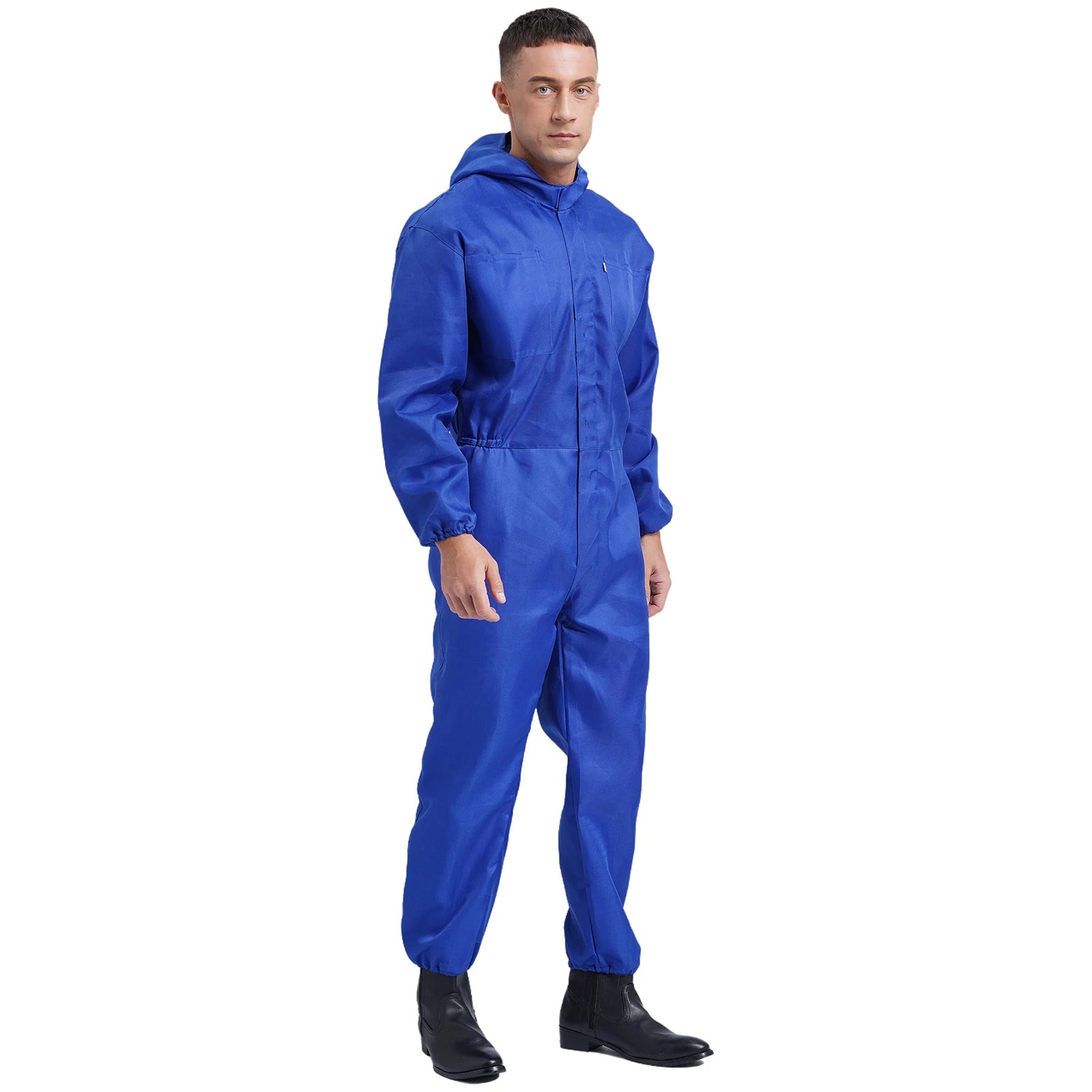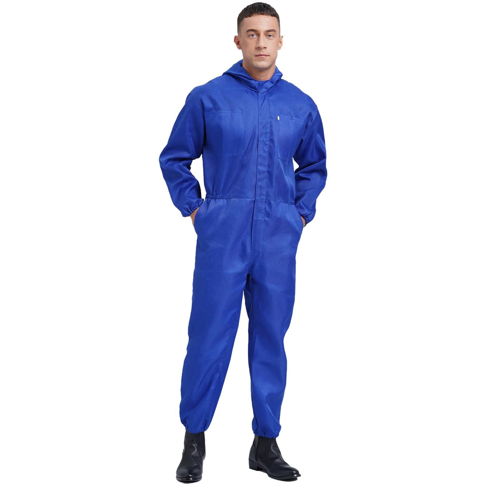 Men’s work overall designs with drawstring hood, long sleeves, front half zipper, long pants and big pockets, one-piece coverall.