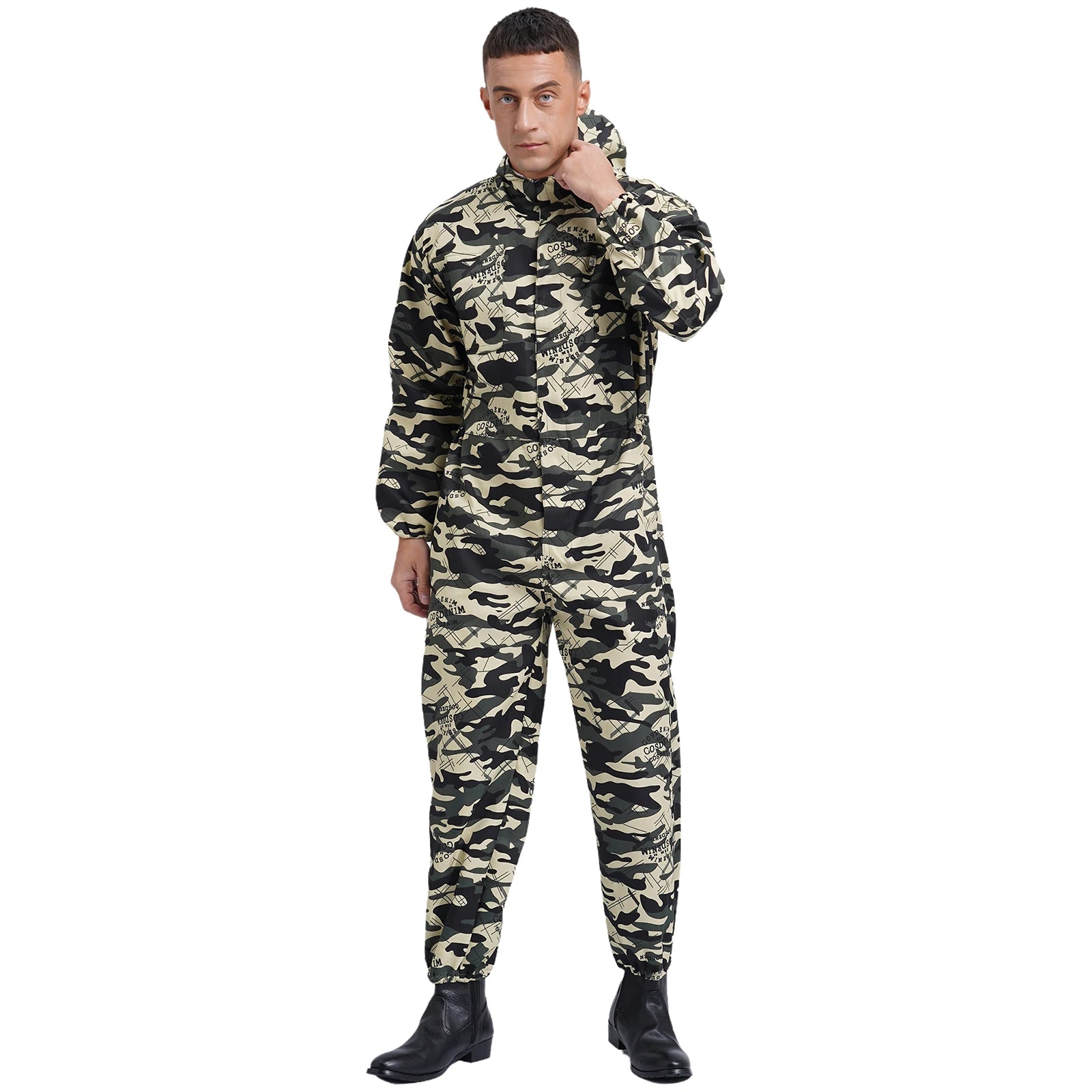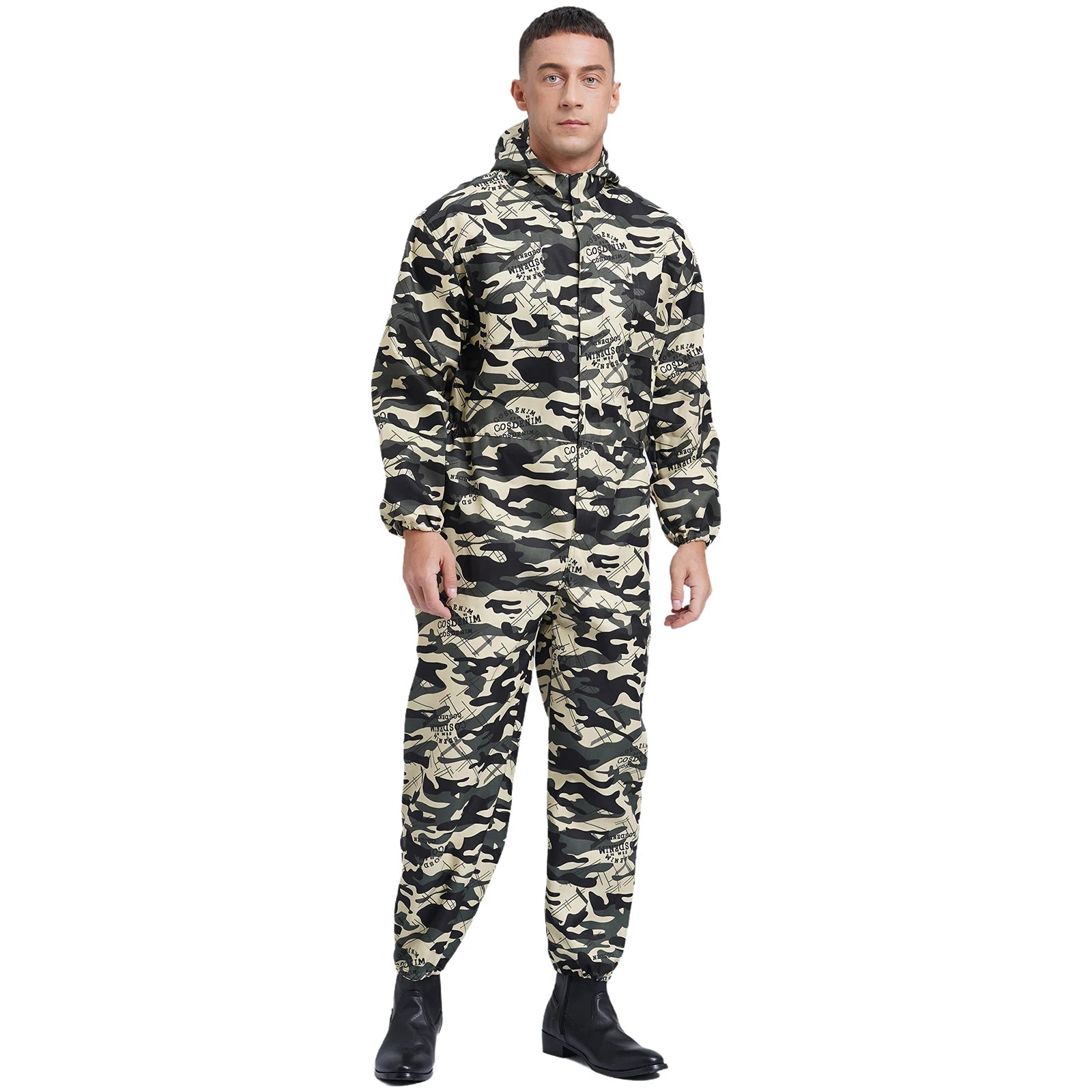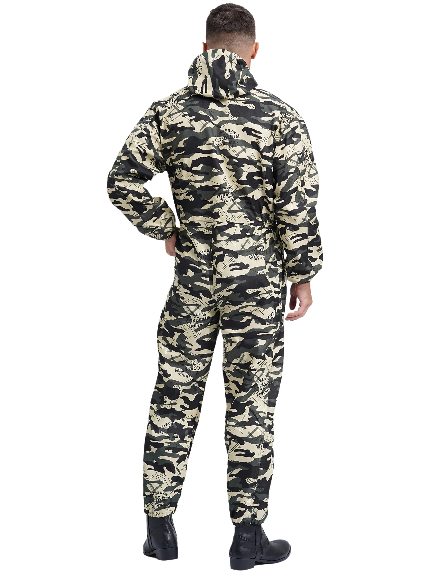 Men’s work overall designs with drawstring hood, long sleeves, front half zipper, long pants and big pockets, one-piece coverall.