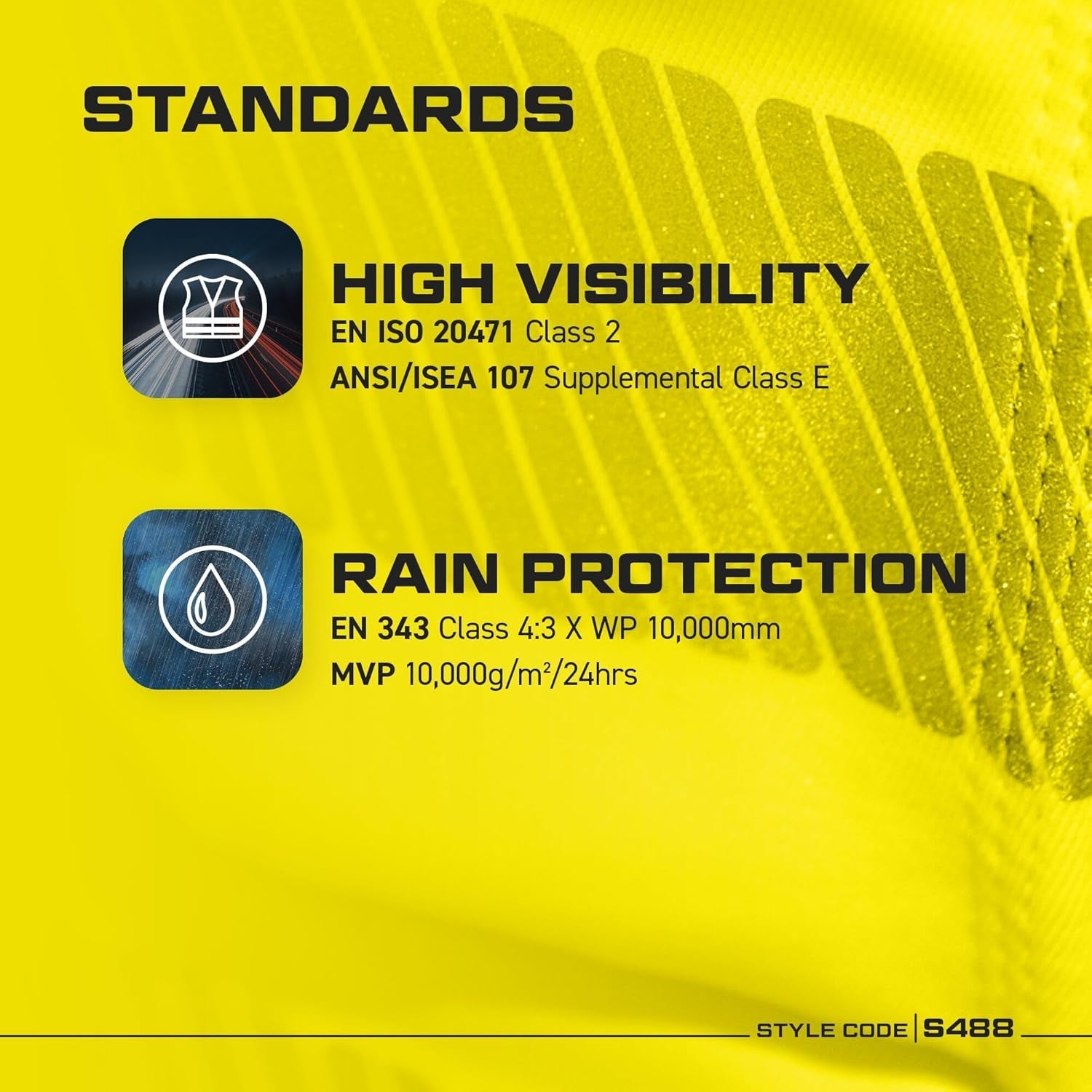 • STANDARDS: ANSI/ISEA 107: 2015 SUPPLEMENTAL CLASS E, RIS-3279-TOM ISSUE 1 (ORANGE ONLY), EN 343:2019 Class 4:3 X WP 10,000mm, MVP 10,000g/m²/24hrs, EN ISO 20471 Class 2