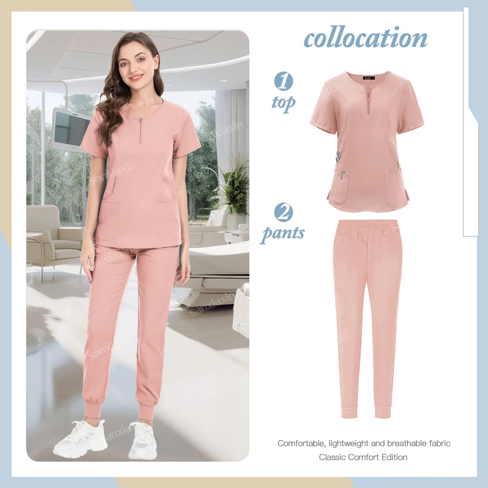 Short Sleeve Scrubs Set Surgical Clothes Nurse Nursing Uniforms Women V-neck Pocket Workwear Dentist Medical Uniforms Tops Pants