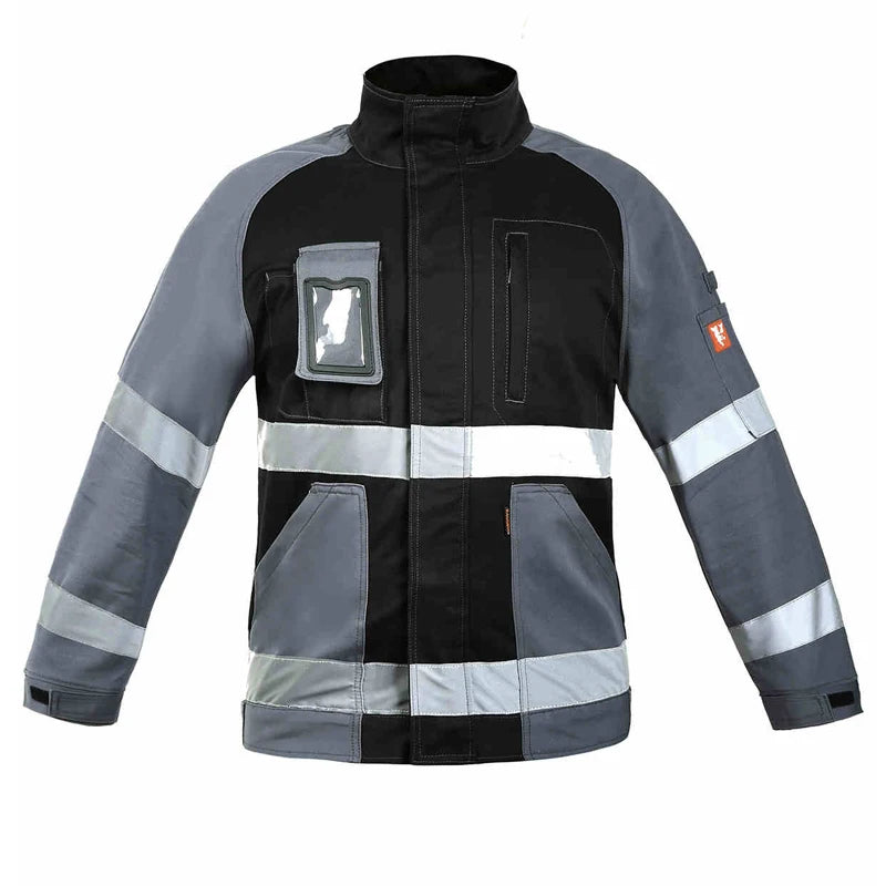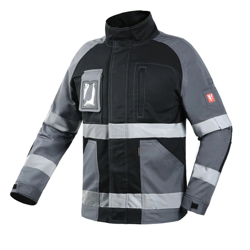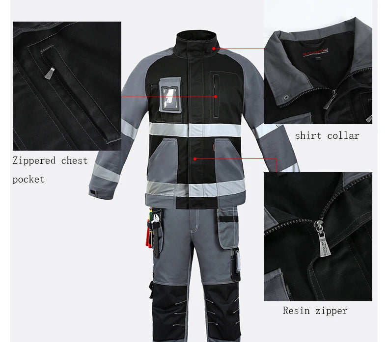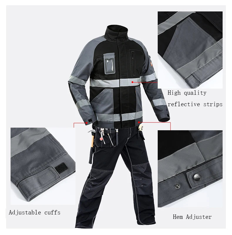 Work Jacket Men Reflective Stripes Black Gray Stitching Coveralls Outdoor CottonMulti-pockets Safety Wear-resistant Workwear